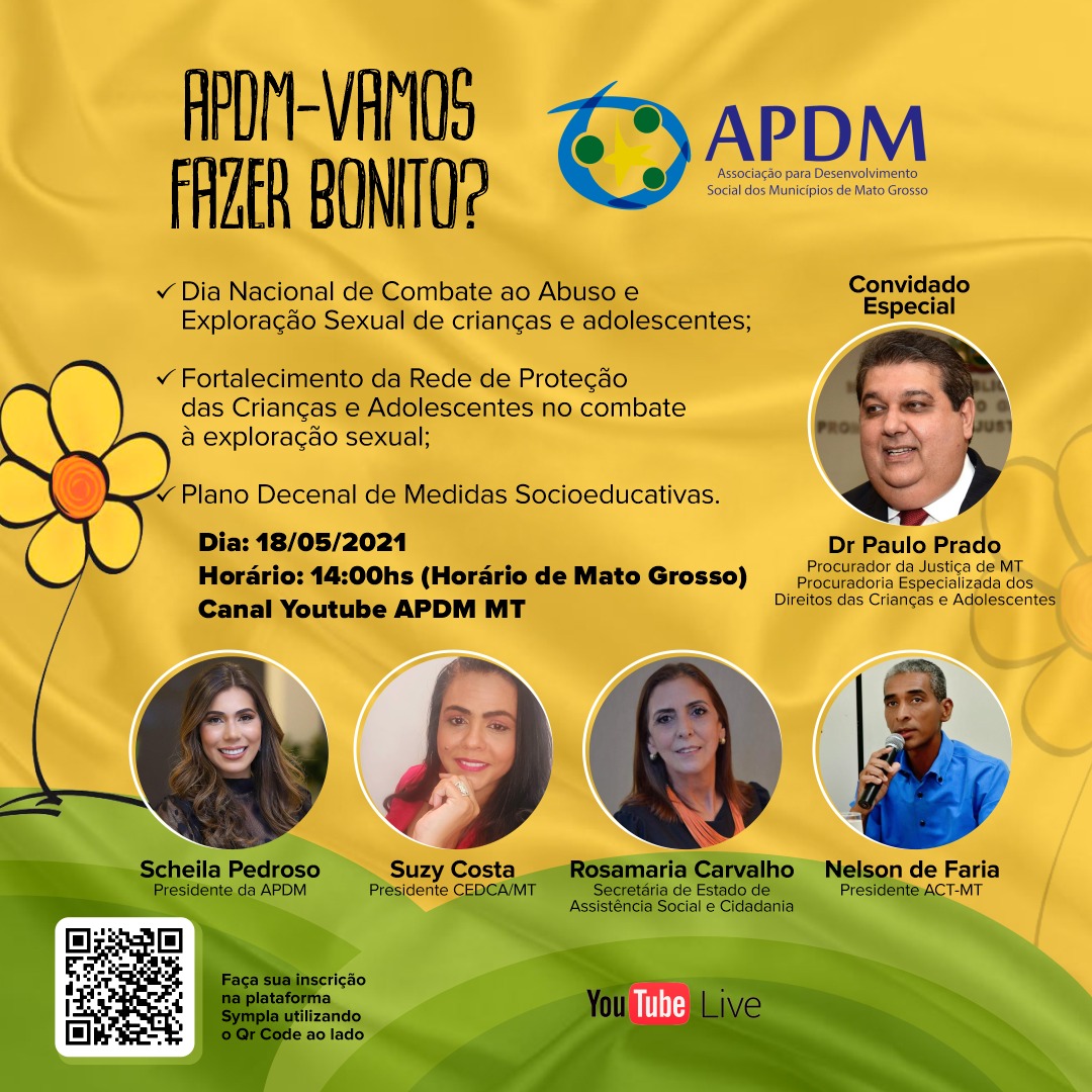 Com objetivo de debater o combate ao abuso e exploração sexual de crianças e adolescentes, o fortalecimento da rede de proteção da infância e juventude e o Plano Decenal de Medidas Socioeducativas, a Associação para Desenvolvimento Social dos Municípios de Mato Grosso (APDM) promove, em parceria com o Ministério Público do Estado, a live “Vamos fazer bonito?”. O encontro será virtual, em razão da pandemia da Covid-19, no dia 18 de maio, a partir das 14h (horário local), com transmissão ao vivo pelo canal da APDM no YouTube.