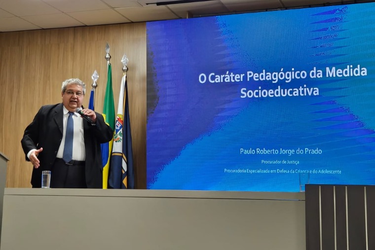 O titular da Procuradoria de Justiça Especializada na Defesa da Criança e do Adolescente, Paulo Roberto Jorge do Prado, ministrou nesta terça-feira (16) palestra magna com o tema “O caráter pedagógico da medida socioeducativa”, no Curso de Formação Inicial para os novos agentes da segurança do socioeducativo. Sessenta e oito servidores, sendo 53 homens e 15 mulheres, estão sendo capacitados para o exercício de atividades com adolescentes em conflito com a lei que cumprem medida judicial em unidades do Estado.