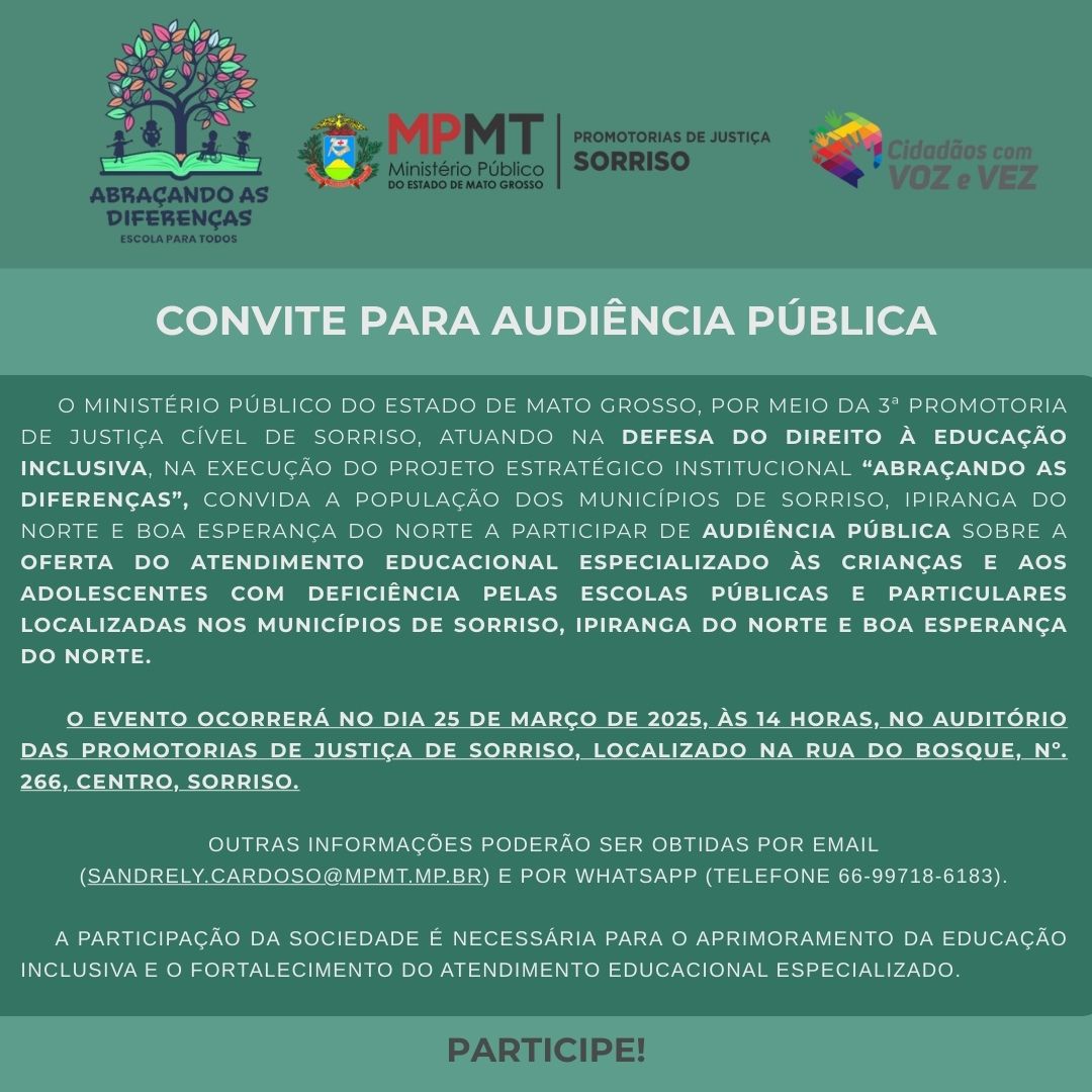 A 3ª Promotoria de Justiça Cível de Sorriso (a 397km de Cuiabá), executando o projeto estratégico institucional “Abraçando as diferenças”, realiza no dia 25 de março, a partir das 14h, audiência pública para debater a defesa do direito à educação inclusiva nas escolas da região.