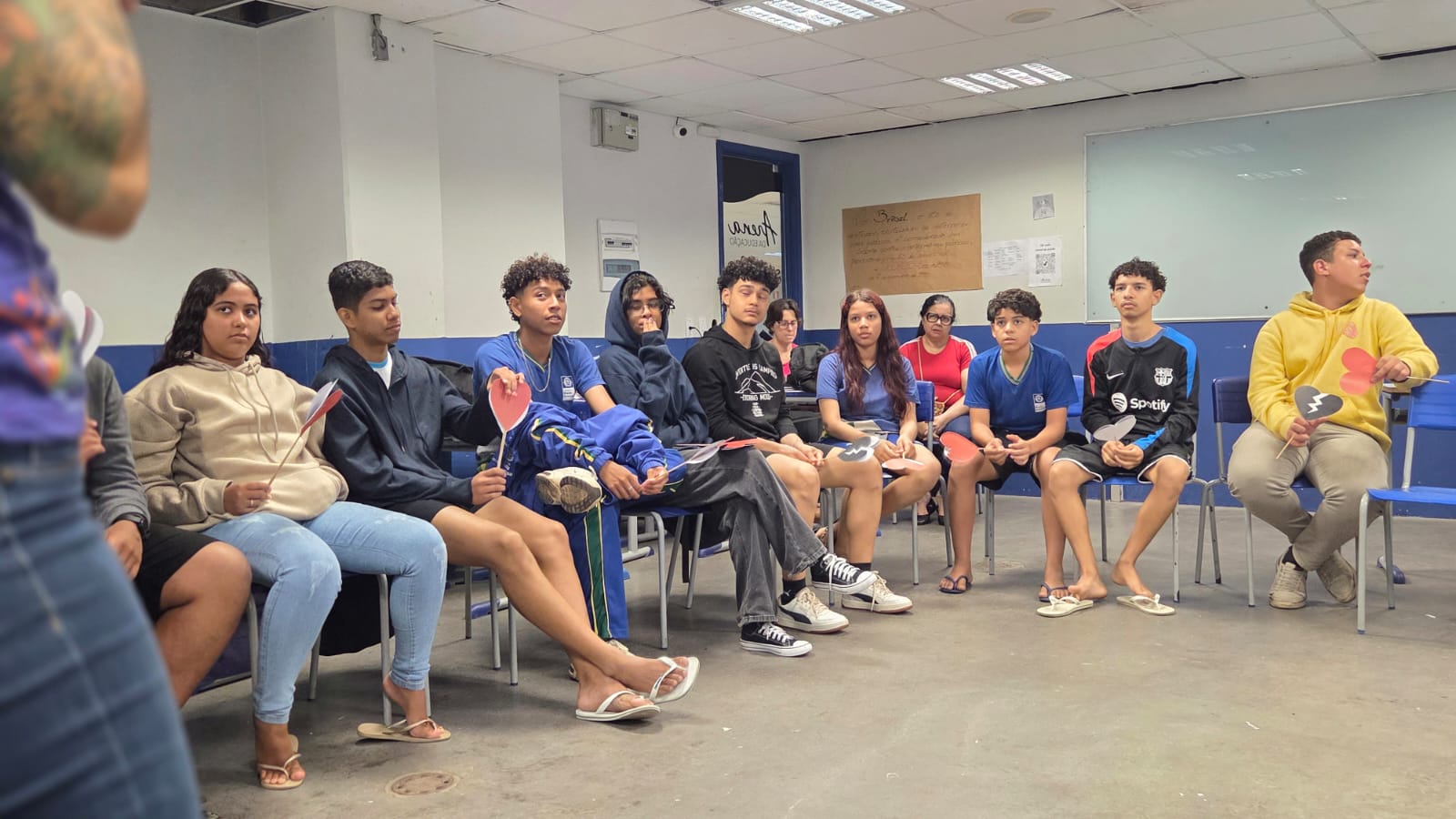 A dinâmica com mais engajamento dos estudantes é que trata das diferenças entre amor e abuso. Nela, os jovens respondem a sete perguntas levantando duas plaquinhas: uma com um coração vermelho (representando o amor) e outra com um coração preto partido (simbolizando o abuso). As questões abordavam situações relacionadas a ciúmes, controle, posse e toxicidade nos relacionamentos, gerando debates intensos e reflexões entre os participantes.