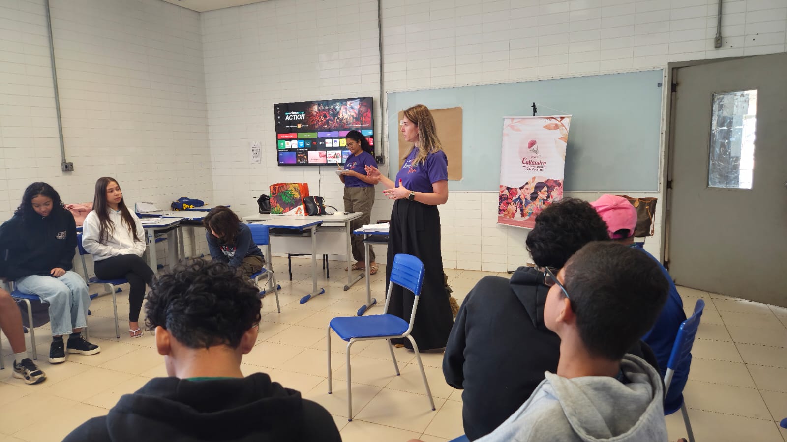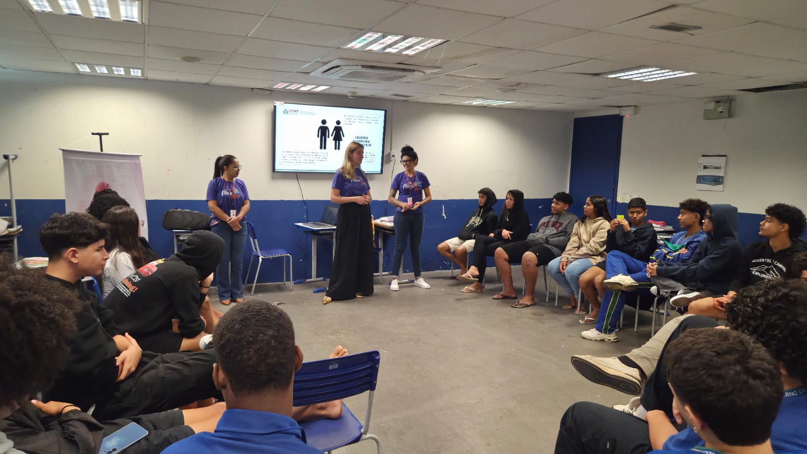 Durante sua apresentação, a promotora explicou brevemente a atuação das Promotorias de Justiça nos casos de violência contra a mulher e destacou os objetivos do projeto. “Estamos levando esse projeto às escolas com a ideia de prevenir casos de violência. Queremos contribuir para uma geração mais consciente e estimular o pensamento crítico. Esse trabalho é leve, divertido, longe do formato tradicional de palestra. É um espaço onde nos permitimos ouvir e discutir”, disse a promotora Claire Vogel.