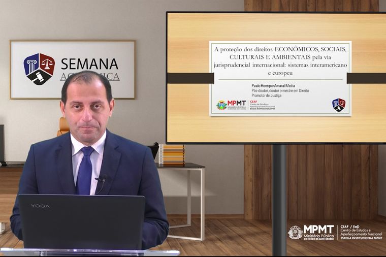 A atuação internacional na defesa dos direitos sociais e ambientais foi o foco do terceiro painel da Segunda Semana Acadêmica do Ministério Público de Mato Grosso (MPMT). Conduzido pelo promotor de Justiça e pós-doutor Paulo Henrique Amaral Motta, o encontro abordou os avanços e desafios dos sistemas Interamericano e Europeu de Direitos Humanos, com destaque para a jurisprudência da Corte Interamericana e seu papel na proteção de direitos econômicos, sociais, culturais e ambientais.