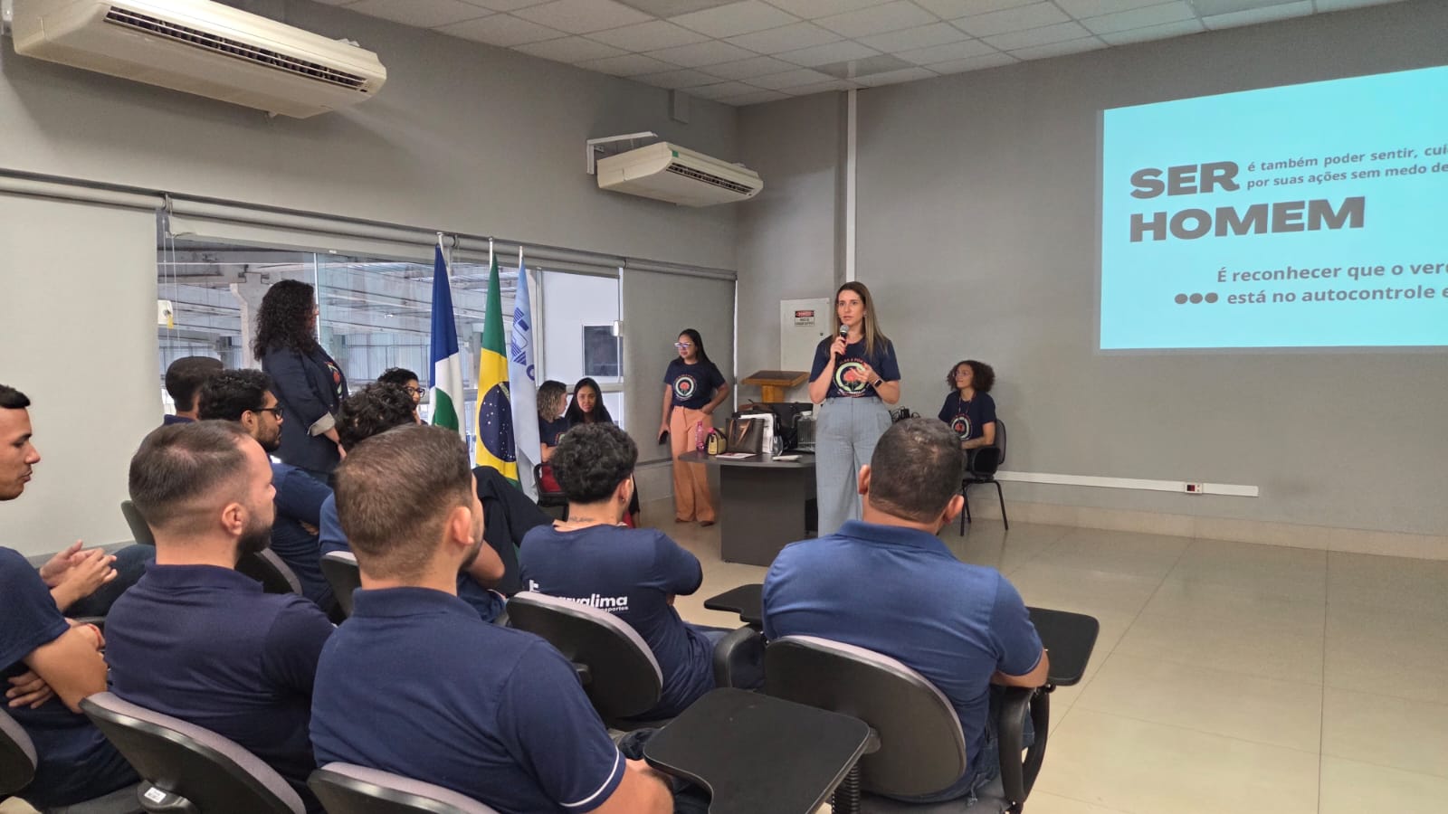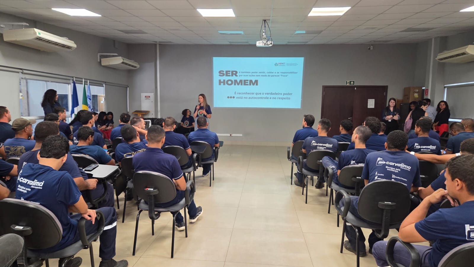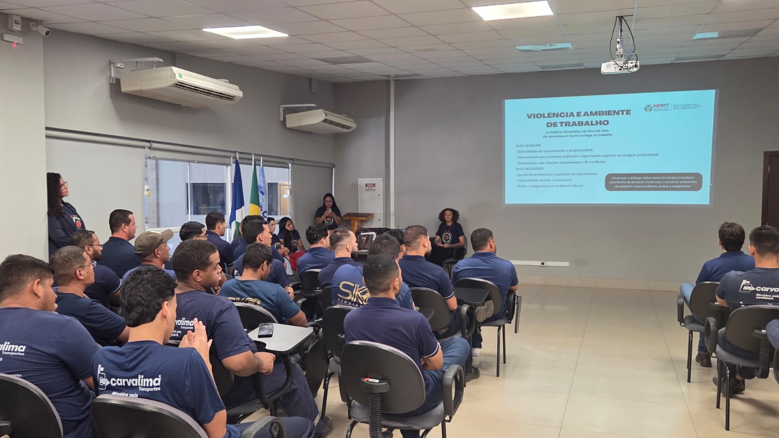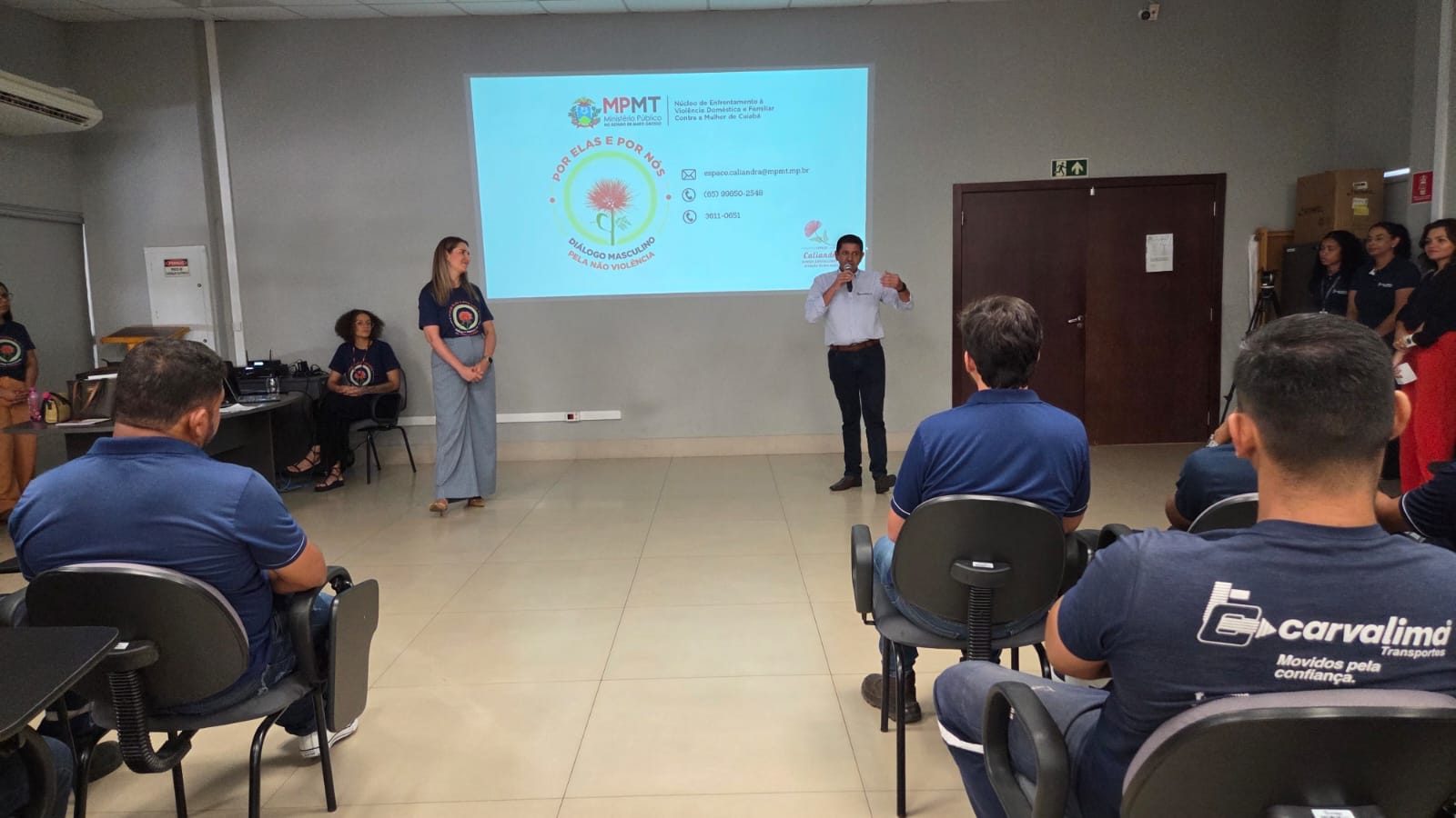 A primeira palestra ocorreu na empresa Carvalima Transportes, que abriu as portas para receber a equipe do Espaço Caliandra, coordenada pela promotora de Justiça Claire Vogel Dutra. Cerca de 100 trabalhadores participaram do encontro, que abordou temas como masculinidade, violência de gênero, formas de violência e legislação.