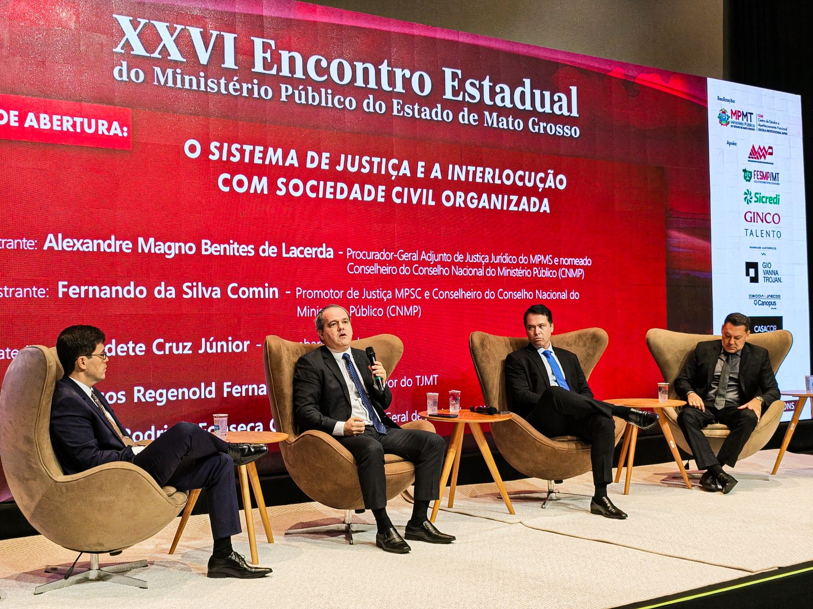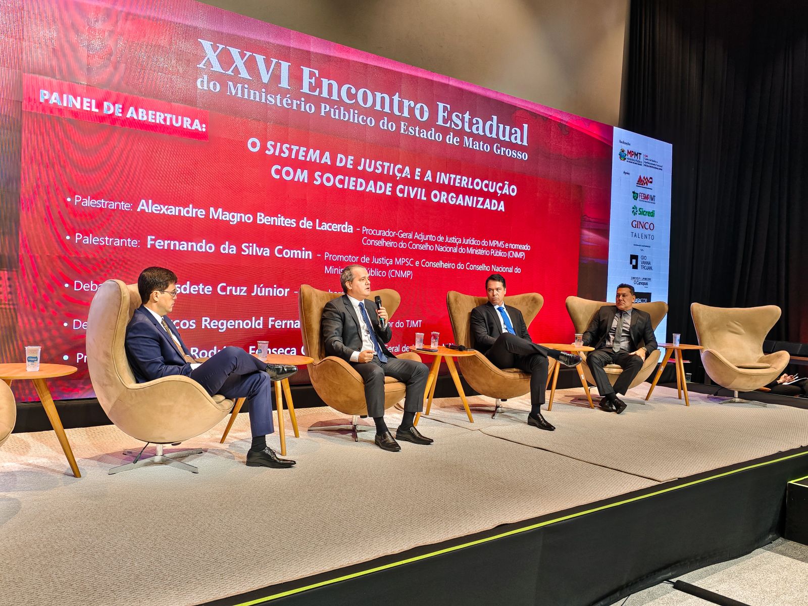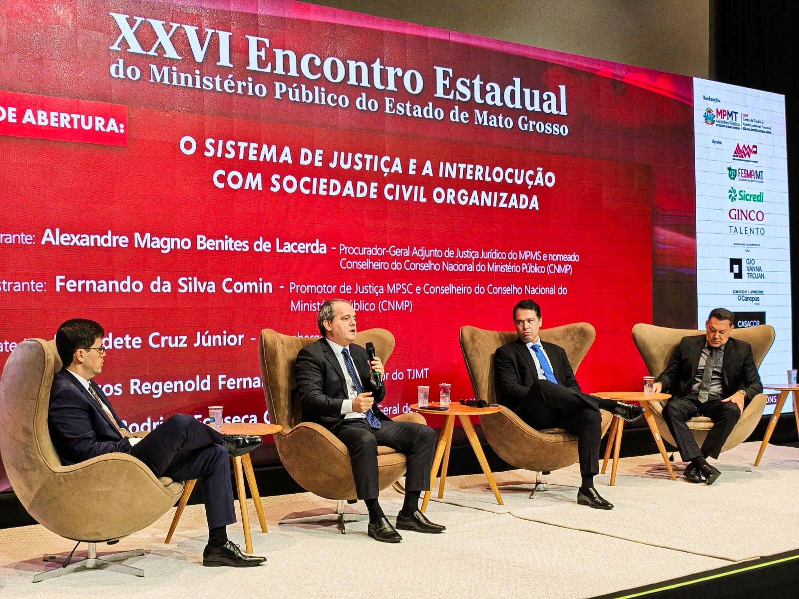 Aproximação entre Justiça e sociedade – Logo após a solenidade de abertura, o primeiro painel do encontro abordou o tema “O Sistema de Justiça e a Interlocução com a Sociedade Civil Organizada”. A palestra foi conduzida pelo procurador-geral adjunto de Justiça Jurídico do Ministério Público de Mato Grosso do Sul (MPMS) e conselheiro nomeado do CNMP, Alexandre Magno Benites de Lacerda, com debate mediado pelo procurador-geral de Justiça Rodrigo Fonseca Costa e participação dos desembargadores do Tribunal de Justiça de Mato Grosso (TJMT) Deosdete Cruz Junior e Marcos Regenold Fernandes.