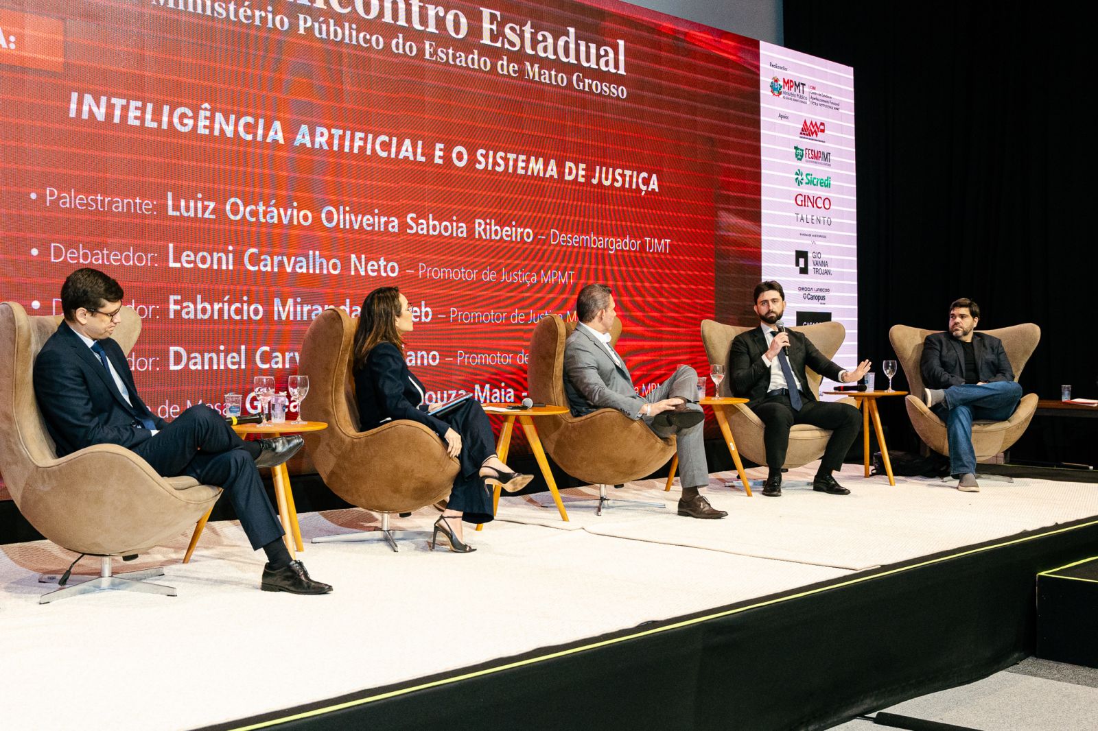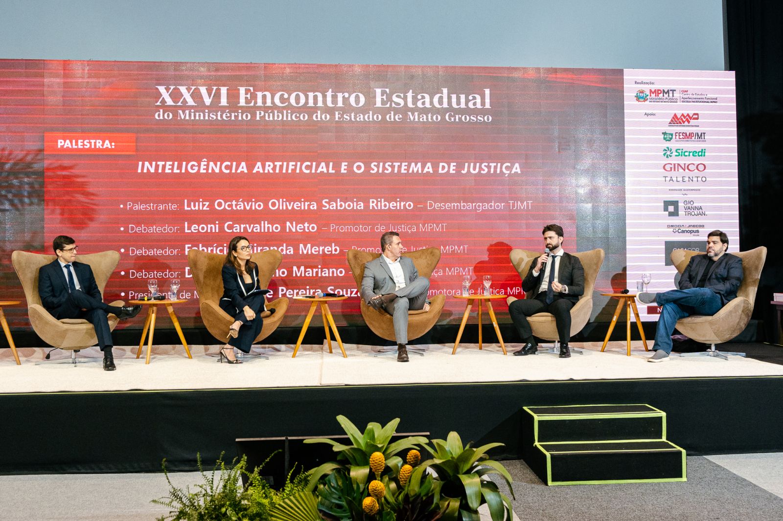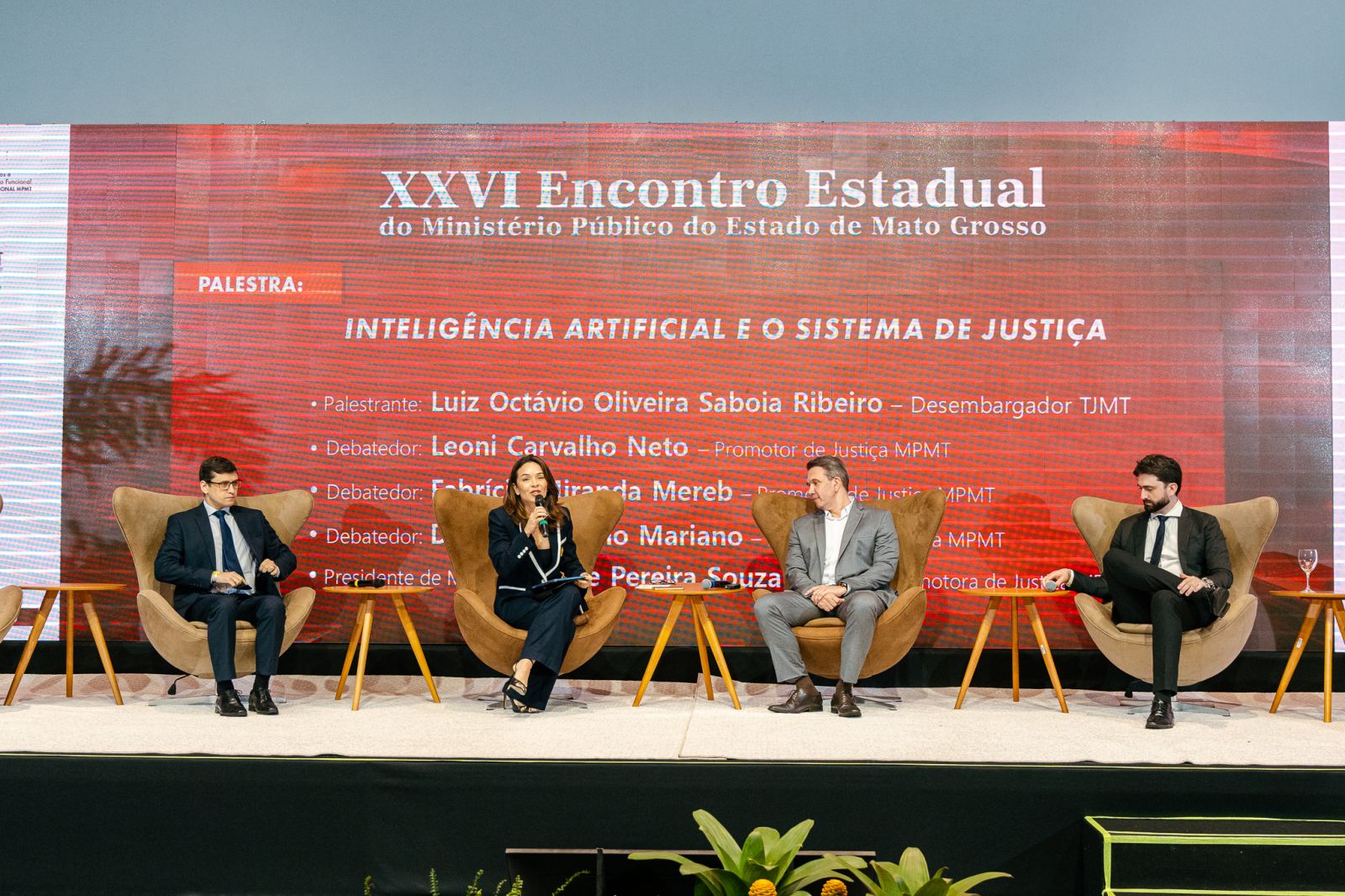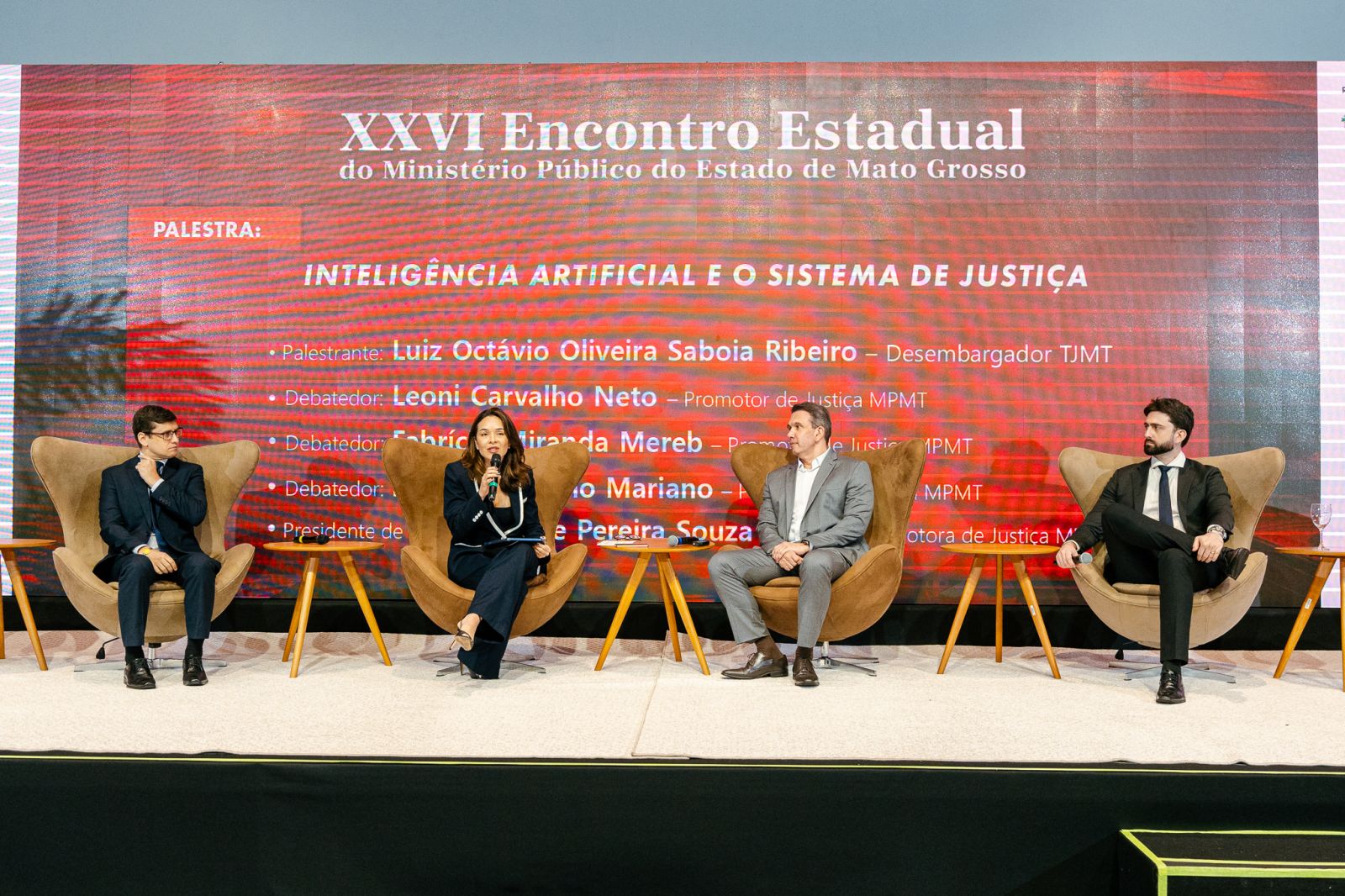 No segundo dia do XXVI Encontro Estadual do Ministério Público do Estado de Mato Grosso, nesta quarta-feira (10), os participantes do evento acompanharam a palestra “Inteligência Artificial e o Sistema de Justiça”, ministrada pelo desembargador Luiz Octávio Saboia Ribeiro. O painel ainda contou com a presidência da promotora de Justiça Gileade Pereira de Souza Maia e dos promotores de Justiça Fabrício Miranda Mereb, Daniel Carvalho Mariano e Leoni Carvalho Neto, como debatedores.