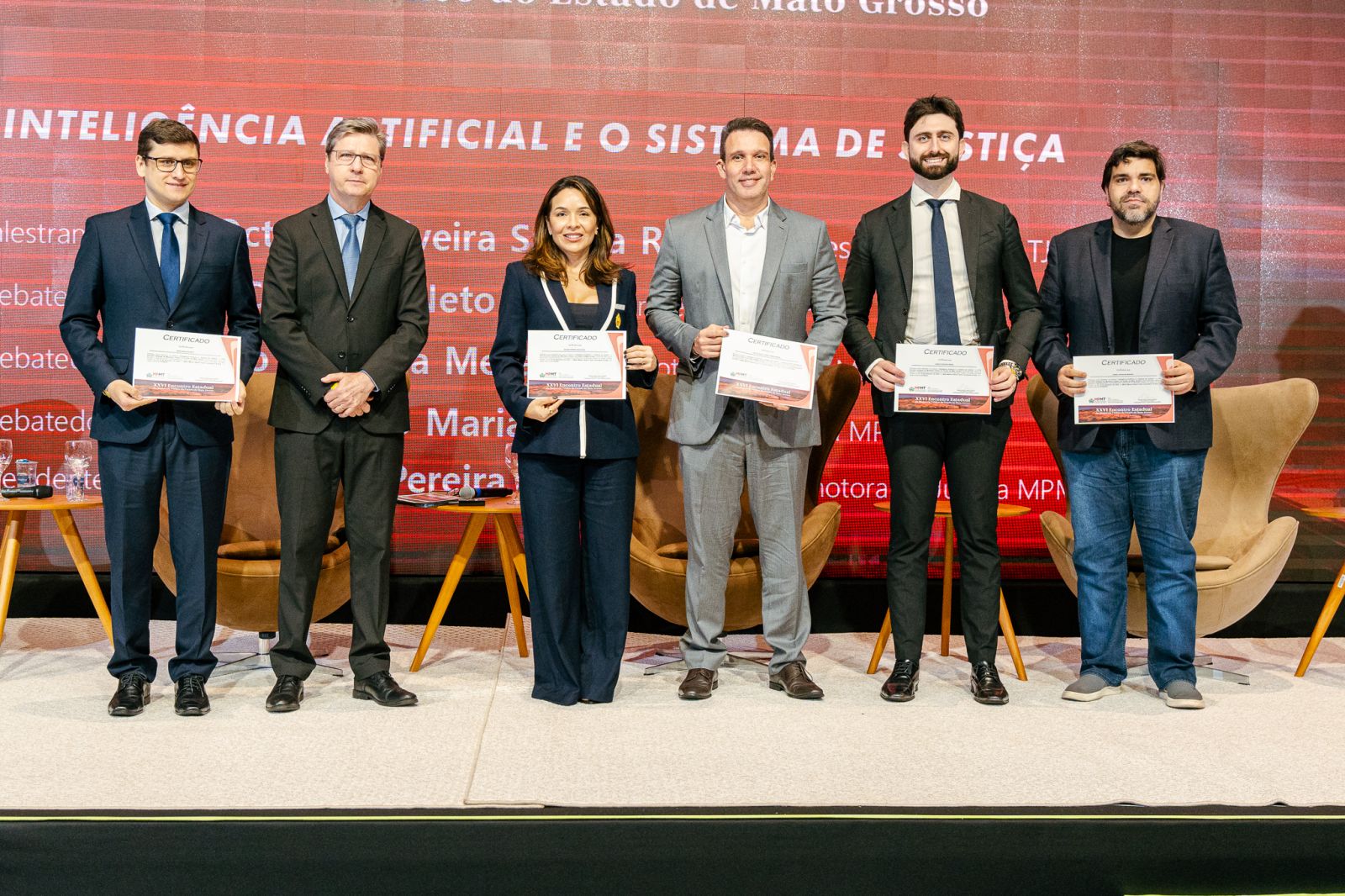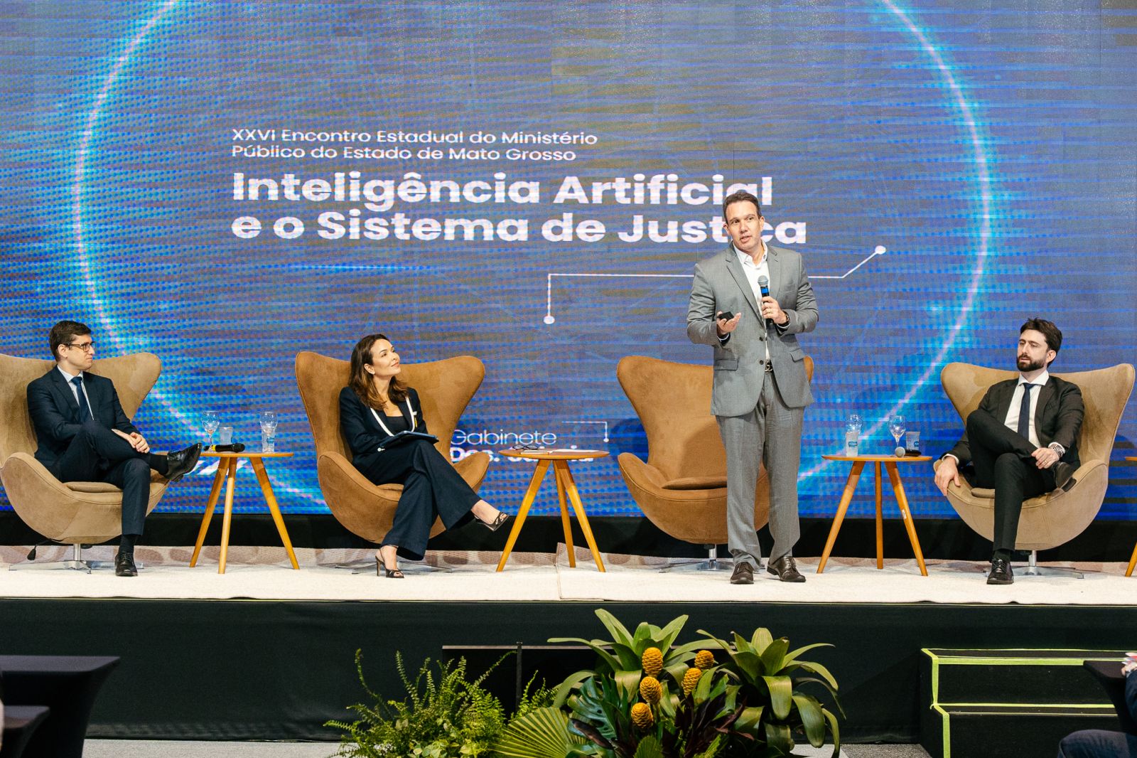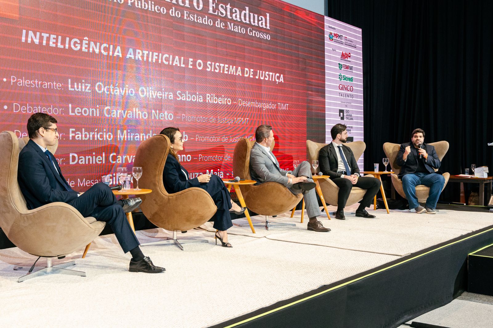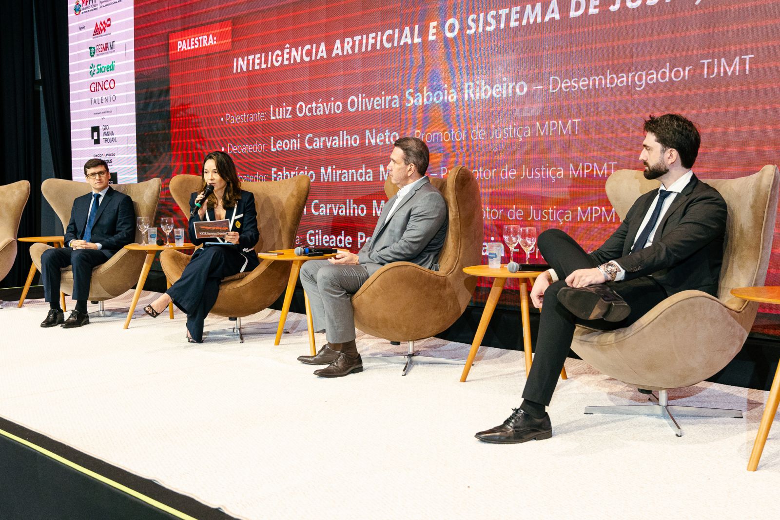 No segundo dia do XXVI Encontro Estadual do Ministério Público do Estado de Mato Grosso, nesta quarta-feira (10), os participantes do evento acompanharam a palestra “Inteligência Artificial e o Sistema de Justiça”, ministrada pelo desembargador Luiz Octávio Saboia Ribeiro. O painel ainda contou com a presidência da promotora de Justiça Gileade Pereira de Souza Maia e dos promotores de Justiça Fabrício Miranda Mereb, Daniel Carvalho Mariano e Leoni Carvalho Neto, como debatedores.
