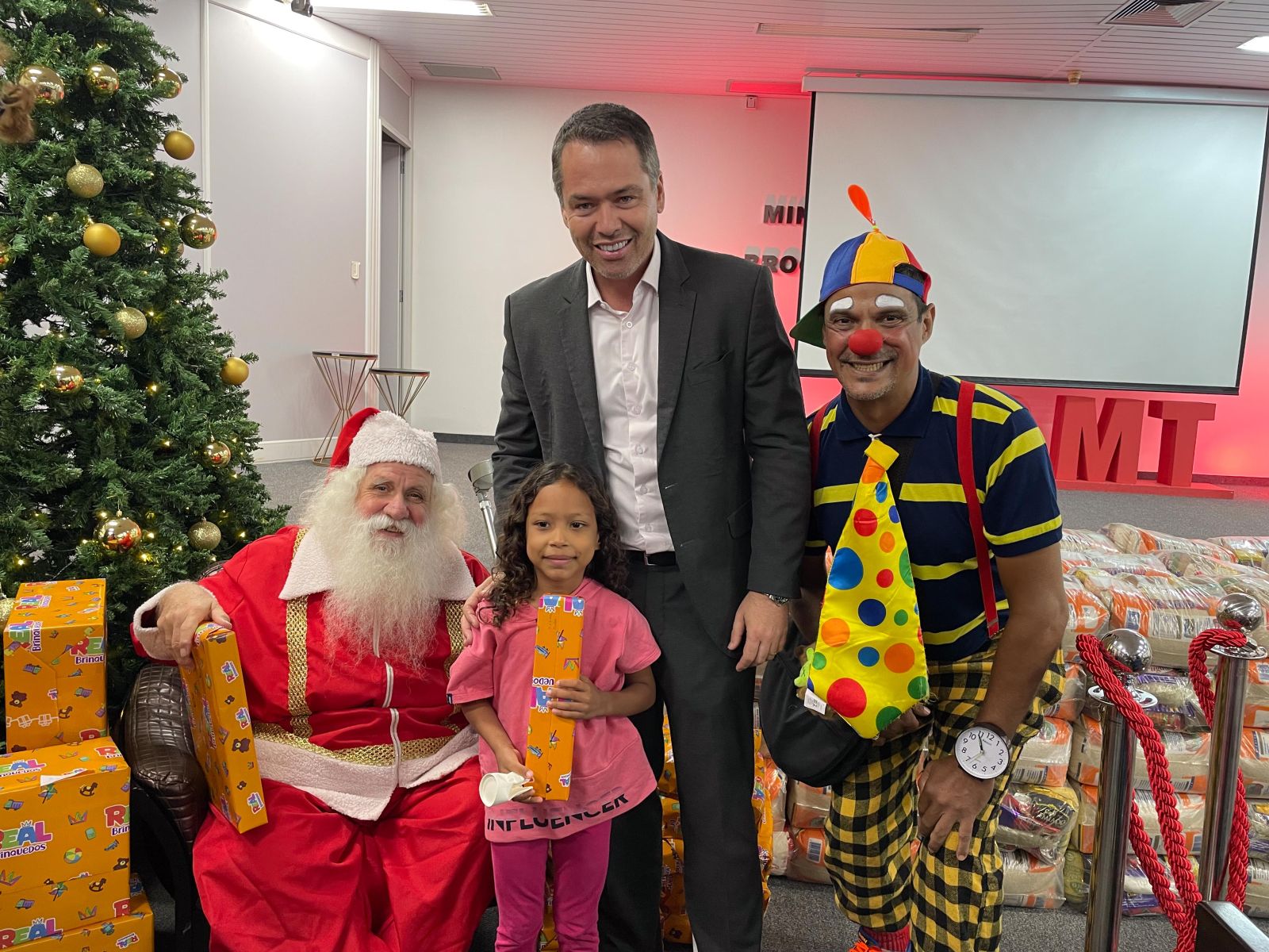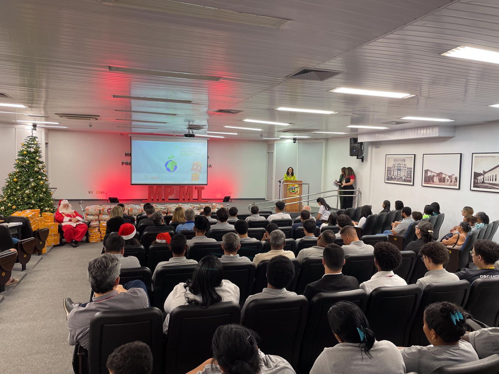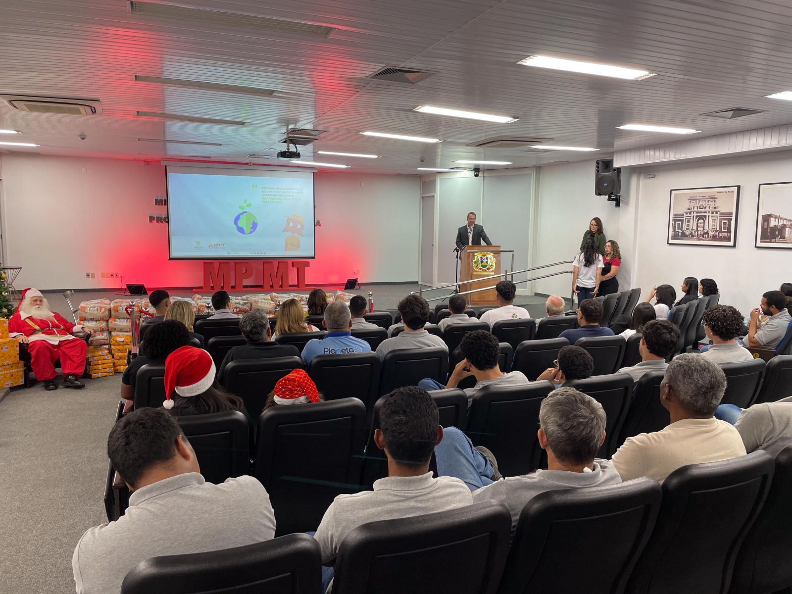 O Ministério Público de Mato Grosso (MPMT), por meio do Núcleo de Qualidade de Vida no Trabalho – Vida Plena, realizou na manhã desta quarta-feira (17), no auditório da Procuradoria-Geral de Justiça, um encontro especial para celebrar o Natal e reconhecer o trabalho dos colaboradores terceirizados que atuam na instituição. Durante o evento, foram entregues cestas básicas, panetones e presentes aos filhos e filhas dos trabalhadores que prestam serviços na sede da PGJ e nas promotorias de Cuiabá e Várzea Grande.