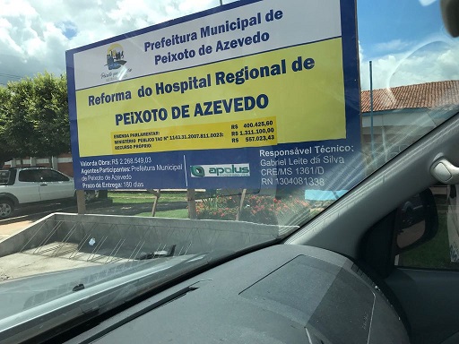 O Hospital Regional de Peixoto de Azevedo está sendo reformado com recursos oriundos de um Acordo Judicial firmado nos autos de uma ação civil pública por ato de improbidade administrativa proposta pelo Ministério Público do Estado de Mato Grosso. Do valor total da obra, o equivalente a R$ 2,2 milhões, R$ 1.311.100,00 foram obtidos por meio do acordo, R$ 400.425,00 de emenda parlamentar e R$ 557.023,43 com recurso próprio do município.