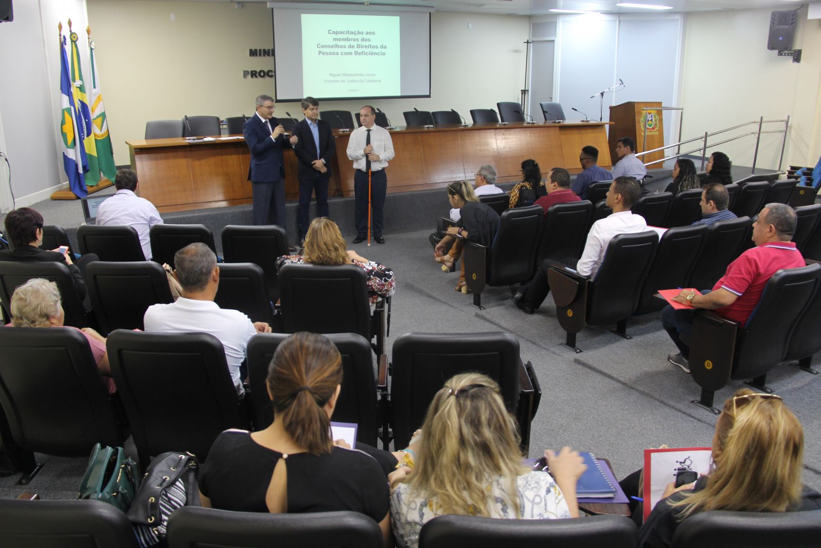 Para propor, acompanhar e avaliar as políticas relativas ao direito da pessoa com deficiência foram criados os Conselhos de Direitos da Pessoa com Deficiência, sejam eles nacional, estaduais ou municipais. Os membros desses conselhos formaram o público da capacitação ministrada pelo Núcleo de Defesa da Cidadania do Ministério Público de Mato Grosso na manhã desta quarta-feira (12 de junho), na sede da Procuradoria-Geral de Justiça de Mato Grosso, com objetivo de instruir e orientar os conselheiros a vencer os desafios impostos a essas organizações no cotidiano.