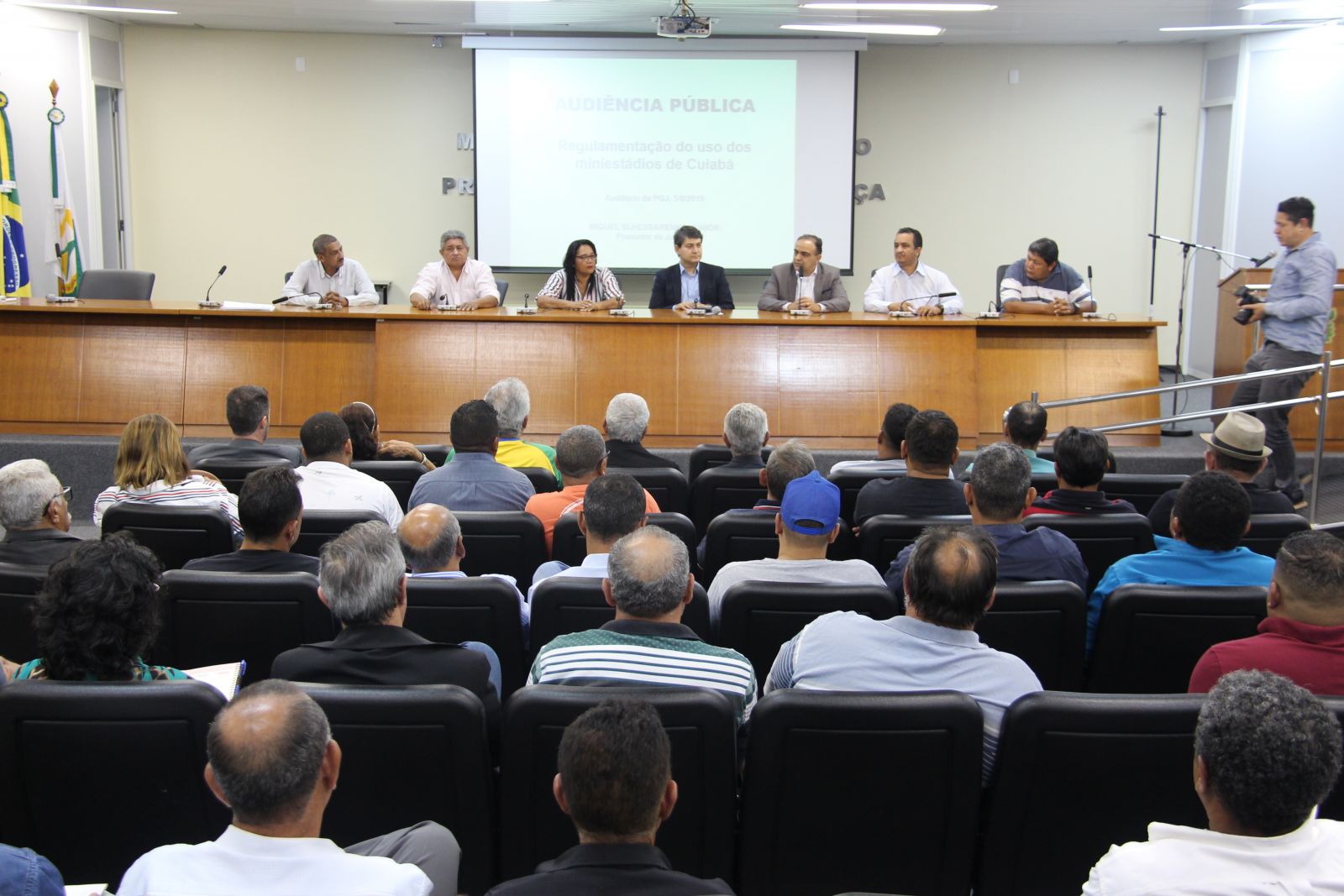 Cerca de 140 pessoas participaram da audiência pública que debateu o uso de miniestádios em Cuiabá, na tarde desta segunda-feira (05), no auditório da Procuradoria-geral de Justiça (PGJ). Os expositores tiveram direito a três minutos de fala. Presidida pelo titular da 8ª Promotoria de Justiça Cível da Capital, promotor de Justiça Miguel Slhessarenko Junior, a audiência teve como objetivo debater de forma ampla com a sociedade a regulamentação do uso de miniestádios proporcionando prestação de contas, manutenção e uso igualitário da sociedade, de maneira a garantir segurança para a comunidade local.