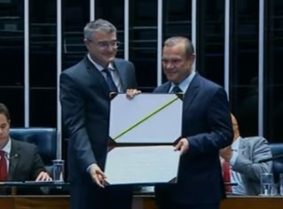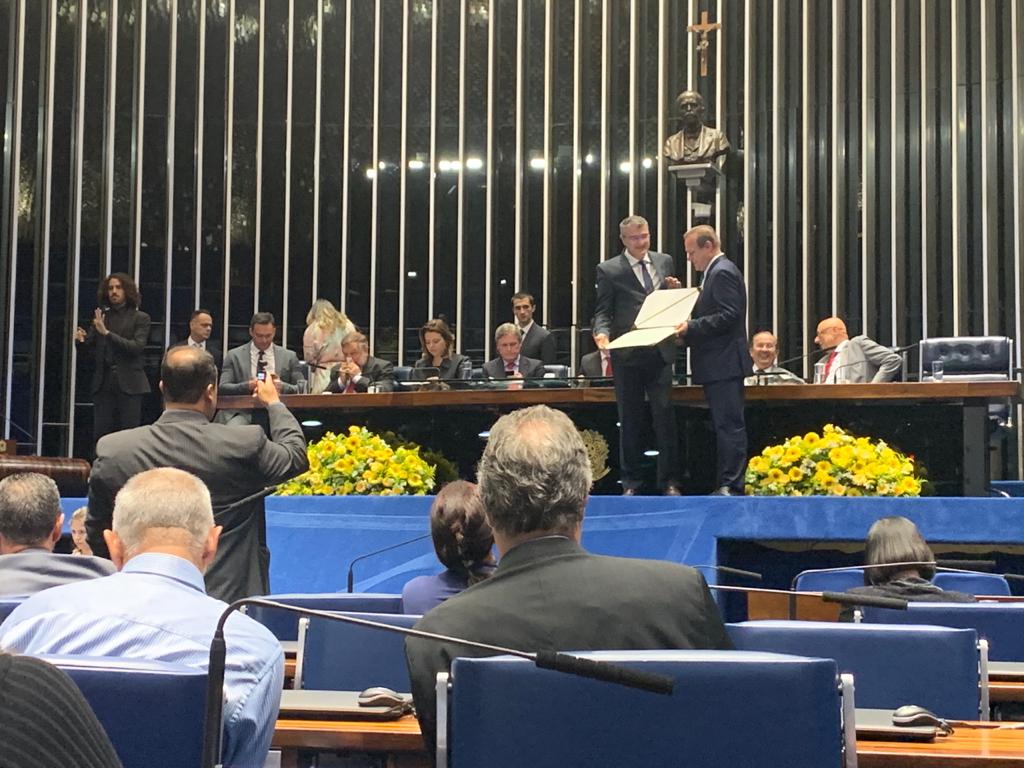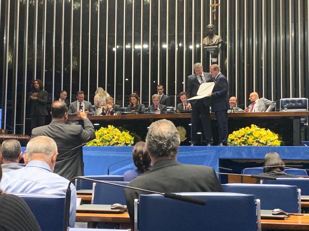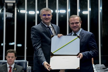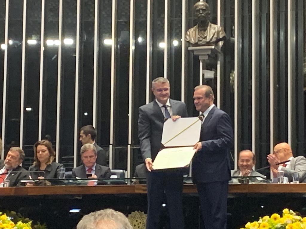 O procurador-geral de Justiça do Estado de Mato Grosso, José Antônio Borges Pereira, recebeu na manhã desta terça-feira (10) a Comenda Zilda Arns, homenagem concedida pelo Senado Federal, por indicação do senador mato-grossense Wellington Fagundes. Instituída por meio da Resolução nº 21 de 2017, a condecoração é destinada a agraciar pessoas ou instituições que desenvolvam, no Brasil, ações e atividades destinadas à proteção da criança e do adolescente. A sessão de entrega da homenagem teve início às 11h, no Plenário do Senado, em Brasília (DF).