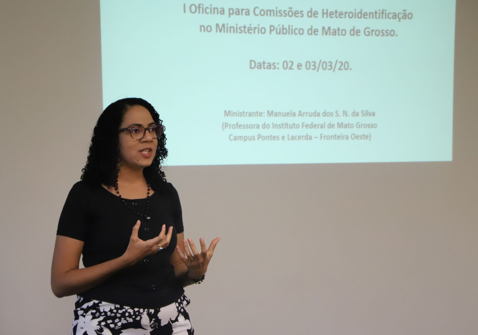 “É uma necessidade estarmos aqui porque temos questões a cumprir. Então que estejamos abertos a disponíveis a ouvir, a nos permitir refletir”, afirmou a instrutora Manuela Arruda dos S. N. da Silva, professora do Instituto Federal de Mato Grosso - campus Pontes e Lacerda. Conforme Manuela, a oficina é um momento importante e fundamental para evitar que os candidatos ao concurso de promotor de Justiça substituto, por exemplo, venham a contestar o certame futuramente.
