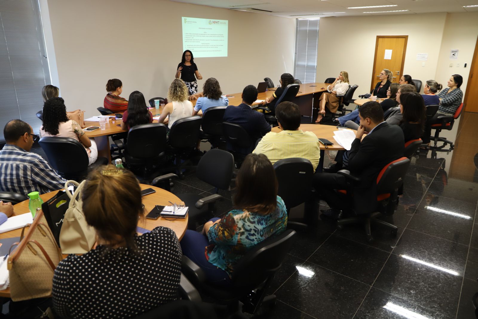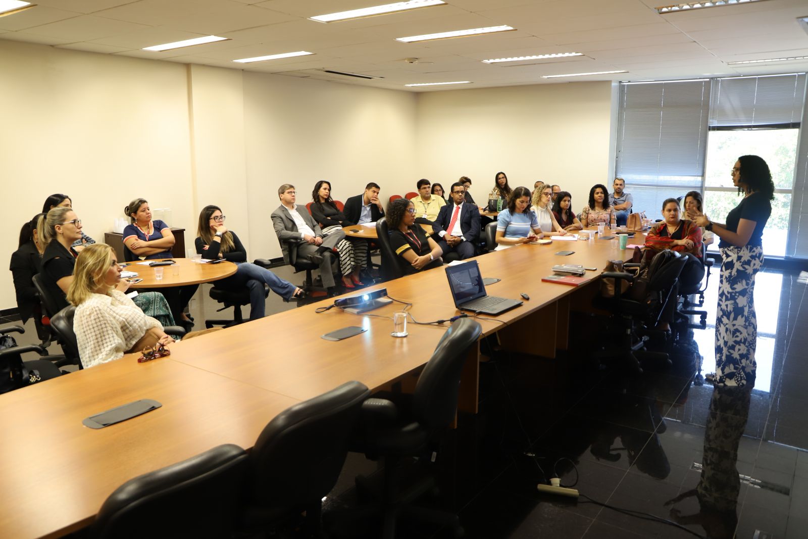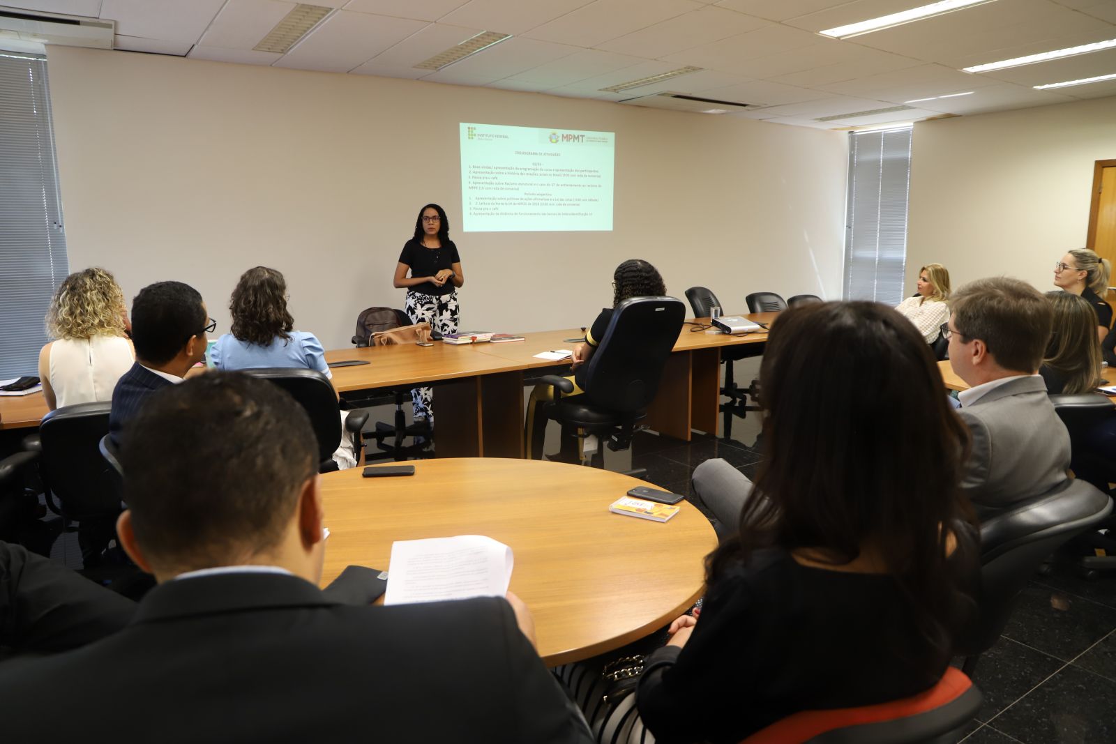 Descrição imagem #PráCegoVer: Foto da sala de reuniões da sede das Promotorias de Justiça, tendo uma mesa ao centro com várias pessoas sentadas ao fundo e a professora em pé explicando o conteúdo.