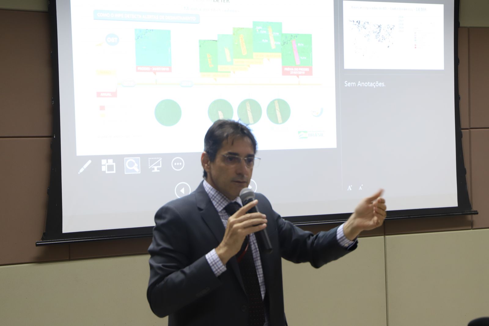 Apresentação - O projeto Satélites Alerta foi apresentado pelo pesquisador associado Eymar Silva Sampaio Lopes e pelo coordenador do Programa de Monitoramento da Amazônia, Cláudio Almeida, do Inpe. Conforme os expositores, o objetivo da iniciativa foi aperfeiçoar a plataforma TerraMA² para que o MPMT realize os cruzamentos entre as bases do Inpe (Prodes - monitoramento do desmatamento, com mapas anuais, Deter - detecção em tempo real do desmatamento, com alertas diários, e Queimadas - monitoramento operacional de focos de queimadas e de incêndios florestais detectados por satélites) e o CAR, bem como produza automaticamente relatórios personalizados com análises do desflorestamento em Mato Grosso.