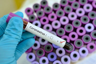 Descrição #PraCegoVer - Imagem de uma mão com luva azul segurando um pequeno tubo de coleta de sangue com tampa roxa com a inscrição impressa "coranavírus" assinalado com caneta vermelha o item positivo, no sinal de mais. Ao fundo outros tubos com tampas roxas e outras unidades na cor dessa família de coloração.