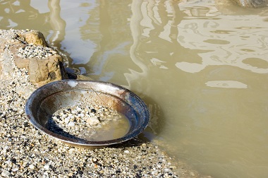 Descrição da Imagem - #PraCegoVer - Vista parcial de um rio, cuja margem é feita de pedras pequenas e aparente solo frágil com uma bateia na margem com um pouco de água e pedras. A água do rio é um marrom claro.