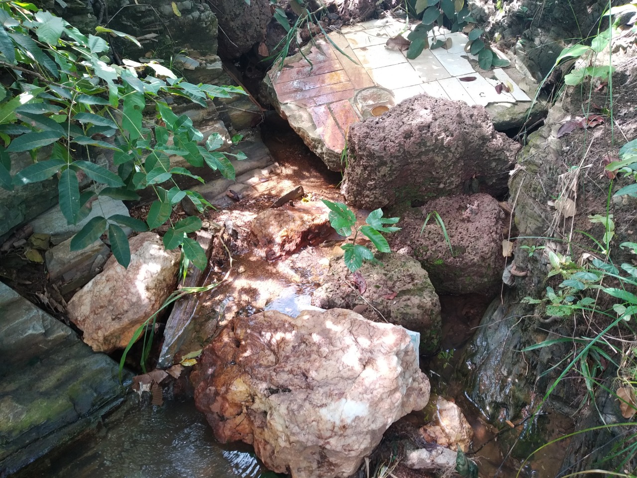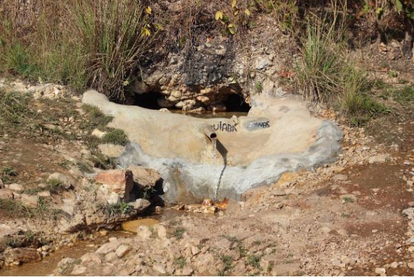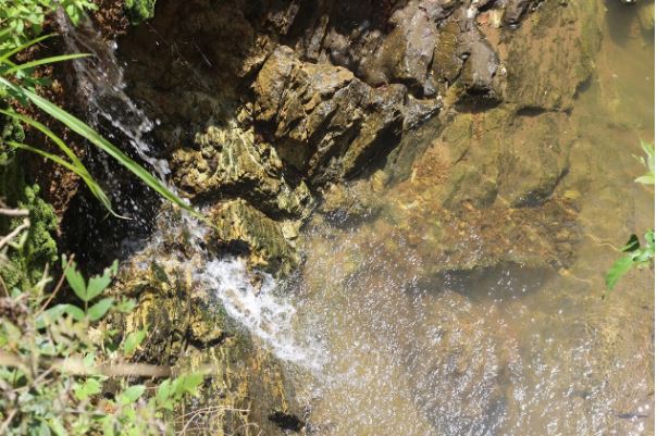 Descrição Imagem #PráCegoVer: Foto de uma nascente com água límpida tendo ao lado direito algumas pedras e do lado esquerdo vegetação.