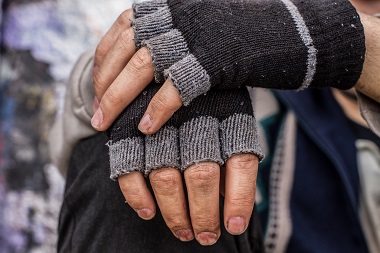 Descrição da Imagem - #PraCegoVer - A imagem mostra parcialmente uma pessoa sentada, somente o tronco, com as mãos encima do joelho. Elas estão com luvas que cobrem metade dos dedos, feitas de crochê, na cor preta e cinza. A imagem é escurecida com um tom cinza.