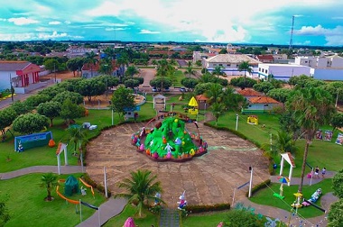 Descrição da imagem #PraCegoVer - Imagem da Praça da cidade arborizada com playgrond e decoração alusiva à Pascoa de 2019, vista do alto, com céu azul.
