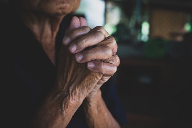 Descrição da Imagem #PraCegoVer - Imagem de um idoso de pele morena com as mãos entrelaçadas como se estivesse em oração, enquadrado à esquerda sem quem apareça o rosto. Fundo escuro à direita com imagem desfocada.