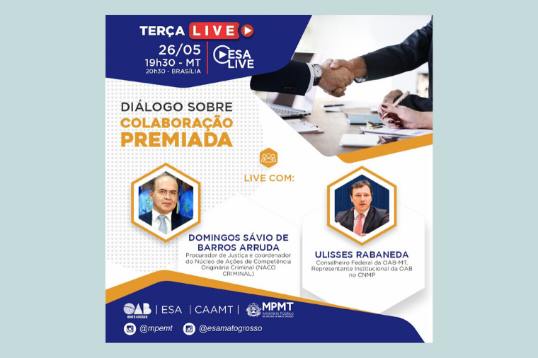 “Diálogo sobre colaboração premiada” é o tema da live que será realizada pelo Ministério Público do Estado (MPMT) em parceria com a Escola Superior de Advocacia de Mato Grosso (ESA-MT), nesta terça-feira (26), a partir das 19h30 (horário local), pelo Instagram. O tema será debatido pelo procurador de Justiça e coordenador do Núcleo de Ações de Competências Originárias (Naco) Criminal do MPMT, Domingos Sávio de Barros Arruda, e pelo conselheiro federal da Ordem dos Advogados do Brasil seccional de Mato Grosso (OAB-MT) e representante institucional da OAB no Conselho Nacional do Ministério Público (CNMP), advogado Ulisses Rabaneda.