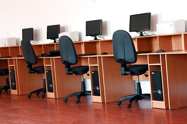 Descrição da Imagem #PraCegoVer - Imagem sugere um laboratório de informática com móveis planejados na cor mogno com quatro jogos de computador tendo compartimentos e bases para o teclado, para monitor e para a CPU. A foto também traz cadeiras giratórias na cor preta. O piso da sala é avermelhado.