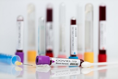 Descrição da Imagem #PraCegoVer - Imagem ao fundo embaçada de vários tubos de coleta de sangue na vertical com tampas de várias cores (roxo, vermelho, amarelo e azul), sobre uma superfície branca, sugerindo testagem de Covid-19 em laboratório. Em primeiro plano e com foco está um frasco na horizontal escrito Covid-19. Do lado esquerdo dele uma agulha e do lado direito um cotonete.