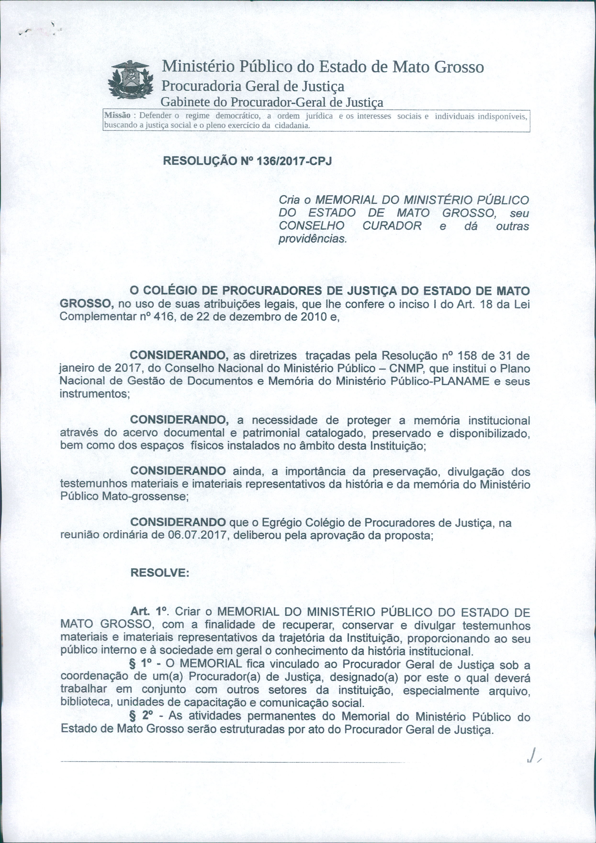 RESOLUÇÃO Nº 136/2017-CPJ - CRIA O MEMORIAL DO MPMT E O SEU CONSELHO CURADOR - 06/07/2017