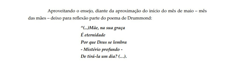 Ao final da decisão, a juíza citou mais uma estrofe do poema de Carlos Drummond de Andrade em lembrança pela aproximação do dia das mães.