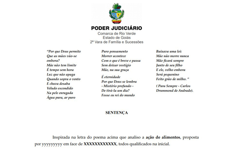 Inspirada no poema “Para Sempre”, de Carlos Drummond de Andrade, que fala sobre a importância da mãe, a juíza Coraci Pereira da Silva determinou que os filhos deem alimentos à mãe, de 91 anos, que é cadeirante e enferma, em Rio Verde, no sudoeste do estado. Cabe recurso da decisão.