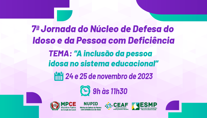 O Ministério Público do Estado do Ceará (MPCE) promove, nos dias 24 e 25 de novembro, das 9h às 11h30, a 7ª edição da Jornada do Núcleo de Defesa do Idoso e da Pessoa com Deficiência (Nupid). Com o tema “A inclusão da pessoa idosa no sistema educacional”, o evento é aberto ao público e possui vagas limitadas. Os interessados em participar da capacitação devem se inscrever previamente pela Plataforma de Cursos da ESMP/CEAF.