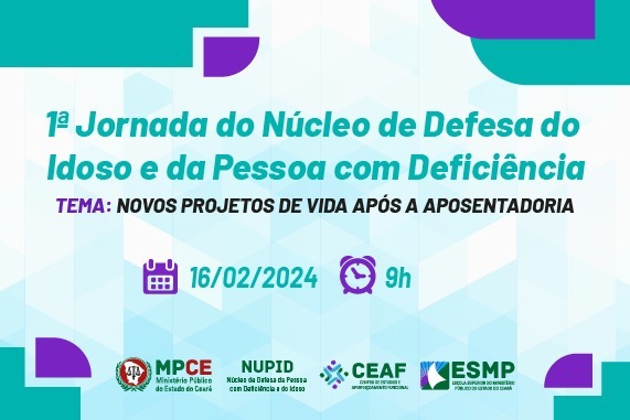 O Ministério Público do Estado do Ceará (MPCE), por meio do Núcleo de Defesa do Idoso e da Pessoa com Deficiência (Nupid), inicia, nesta sexta-feira (16/02), o ciclo de Jornadas do Núcleo de Defesa do Idoso e da Pessoa com Deficiência de 2024. O primeiro encontro está agendado para ocorrer às 9h, no auditório da Escola Superior do Ministério Público (ESMP), localizado no prédio das Promotorias de Justiça de Fortaleza, no bairro Luciano Cavalcante. O público interessado deve se inscrever pela Plataforma de Cursos da ESMP/CEAF.