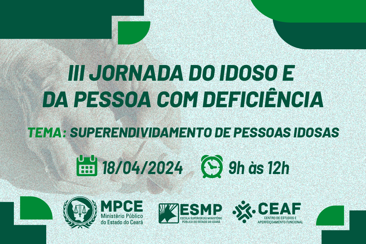 O Ministério Público do Estado do Ceará, por meio do Centro de Estudos e Aperfeiçoamento Funcional (Ceaf) e da Secretaria Executiva das Promotorias de Justiça de Defesa do Idoso e da Pessoa com Deficiência de Fortaleza, com o apoio da Escola Superior do Ministério Público (ESMP), irá promover no dia 18 de abril a III Jornada do Idoso e da Pessoa com Deficiência. O terceiro encontro é aberto ao público e tem como tema o “Superendividamento de Pessoas Idosas”. O evento está agendado para ocorrer às 9h, no auditório da ESMP/CEAF, localizado na sede das Promotorias de Justiça de Fortaleza, no bairro Luciano Cavalcante.