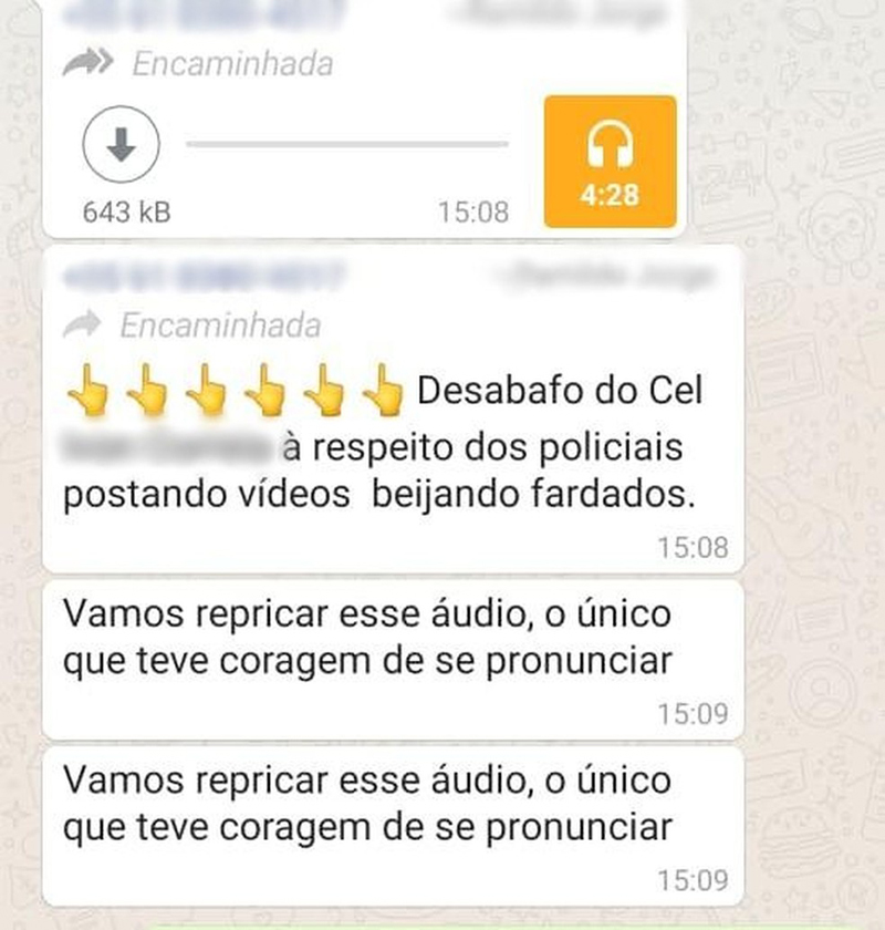 "Os áudios atribuídos a um coronel da Reserva Remunerada manifestam uma opinião pessoal, e serão analisados pela Corporação", afirmava nota enviada à ocasião.