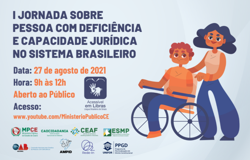 O Ministério Público do Estado do Ceará (MPCE), com apoio de parceiros, promove na próxima sexta-feira (27/08), das 9h às 12h, a “I Jornada sobre pessoa com deficiência e capacidade jurídica no sistema brasileiro”. O evento, que é aberto ao público, será transmitido no Canal do MPCE no Youtube e contará com acessibilidade em libras e audiodescrição.