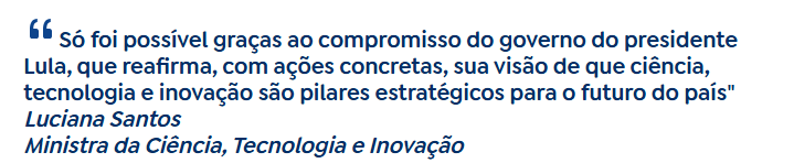 A ministra da Ciência, Tecnologia e Inovação, Luciana Santos, destacou que a nova lei consolida uma das maiores conquistas recentes para o Sistema Nacional de Ciência, Tecnologia e Inovação (SNCTI). “E só foi possível graças ao compromisso do governo do presidente Lula, que reafirma, com ações concretas, sua visão de que ciência, tecnologia e inovação são pilares estratégicos para o futuro do país”, declarou.