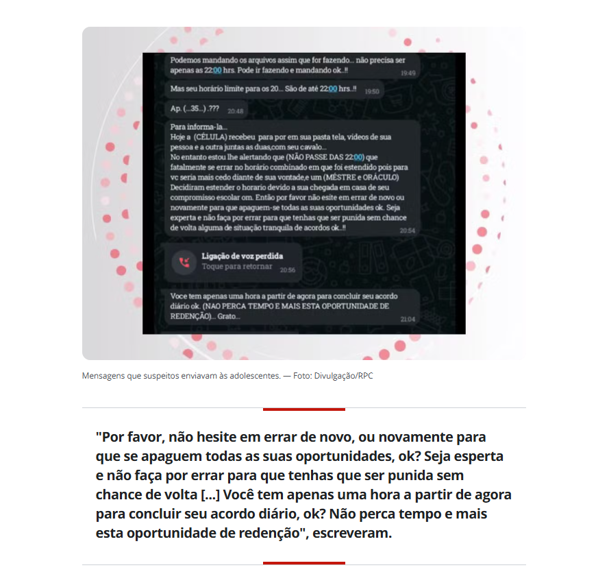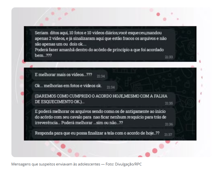 As conversas obtidas com exclusividade pela RPC, afiliada da TV Globo no Paraná, expõem como os suspeitos faziam cobranças constantes, utilizando mensagens com tons de misticismo e ameaças para garantir o envio dos conteúdos diariamente até as 22h. Em alguns trechos, os suspeitos determinavam que as meninas tinham apenas uma hora para concluir o “acordo diário”.