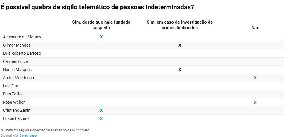 Em abril, ao votar, ministro André Mendonça manifestou preocupação com a possibilidade de que a quebra de sigilo telemático de grupos indeterminados de pessoas acabe se transformando em uma espécie de "fishing expedition" - expressão usada para designar investigações genéricas e amplas, sem base objetiva ou indícios concretos, em busca de eventuais ilícitos.