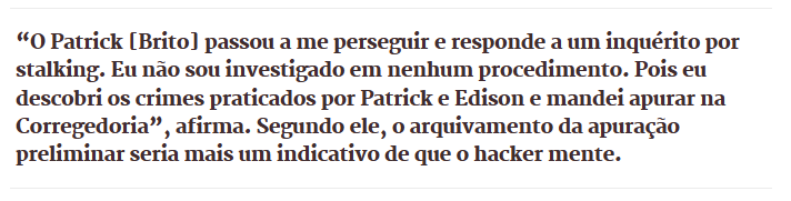 Sobre isso, o relatório diz apenas que são “acusações infundadas”, porque uma outra apuração preliminar já teria investigado o caso. O mesmo foi dito em relação ao comprovante de uma transferência bancária que teria sido feita pela policial para a avó de Brito. A apuração também não analisou mensagens suspeitas trocadas entre Brito e um escrivão. Segundo as investigações, elas seriam de cunho pessoal e não indicariam que o hacker teria colaborado com a polícia de forma ilícita.