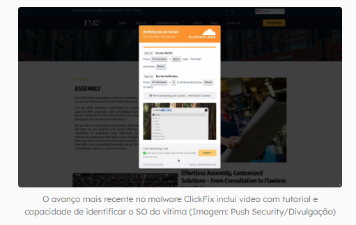 Pesquisadores da Push Security notaram uma mudança na campanha do malware, mais especificamente em uma página falsa de verificação de CAPTCHA na Cloudflare. O agente malicioso foi capaz de identificar o SO do usuário e providenciar um tutorial por vídeo ensinando como e onde copiar e colar os comandos fraudulentos.