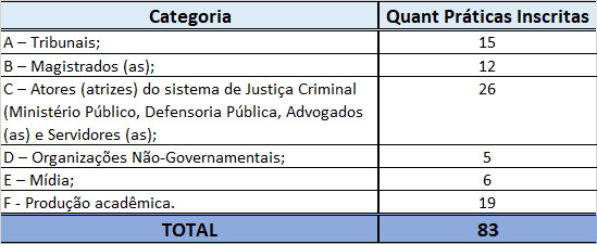 Os projetos contemplam as seis categorias da premiação: tribunais, representantes da magistratura, do Sistema de Justiça Criminal – Ministério Público, Defensoria Pública – da advocacia, servidores, além das categorias direcionadas à mídia, produção acadêmica e organizações não-governamentais.
