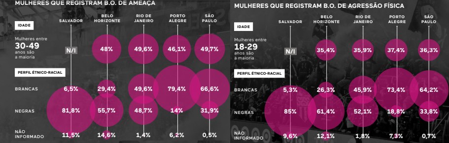 O estudo também apresenta recortes etários e étnico-raciais acerca das mulheres que registraram boletins de ocorrência de ameaça e agressão física nas cinco capitais.
