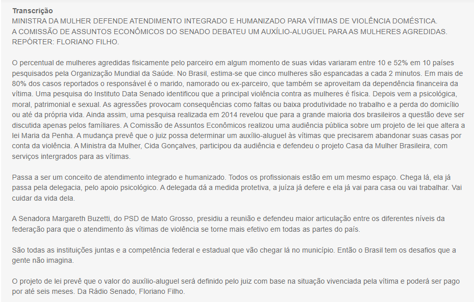 Ministra da Mulher defende no Senado atendimento integrado e humanizado para vítimas de violência doméstica. A Comissão de Assuntos Econômicos do Senado debateu um pojeto que cria um auxílio-aluguel para as mulheres agredidas (PL 4875/2020). A Senadora Margareth Buzetti (PSD-MT) defendeu maior articulação entre os diferentes níveis da federação para que o atendimento às vítimas de violência se torne mais efetivo em todas as partes do país.