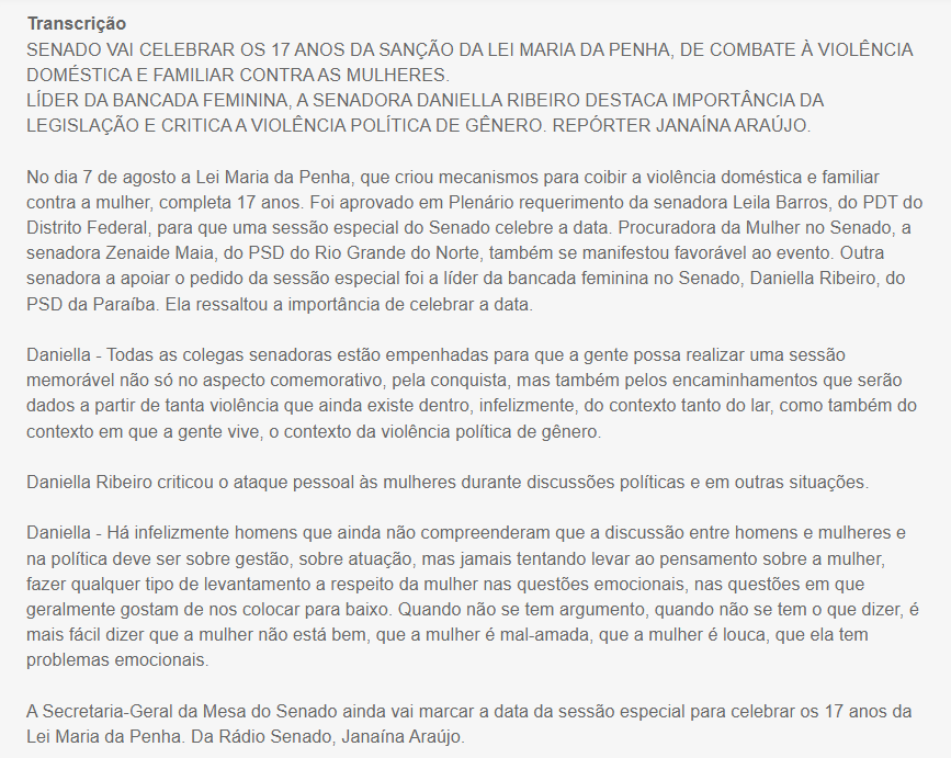 Requerimento da senadora Leila Barros (PDT-DF) aprovado em Plenário prevê realização de Sessão Especial, em data a ser marcada, para comemorar os 17 anos da Lei Maria da Penha (11.340/2006). O pedido para o evento teve apoio da senadora Zenaide Maia (PSD-RN) e da líder da bancada feminina no Senado, Daniella Ribeiro (PSD-PB), que chamou a atenção para a importância da legislação e criticou a violência de gênero na política e outras instâncias.