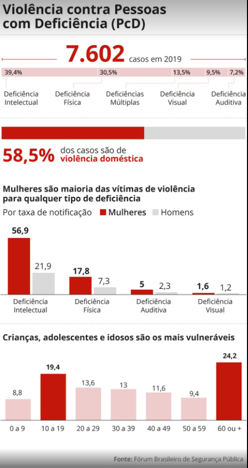 Para as demais pessoas com deficiência, os valores são bem inferiores: foram 11,4 notificações de violências para cada 10 mil pessoas com deficiência física em 2019, caindo para 3,6 para pessoas com deficiência auditiva e 1,4 no caso de pessoas com deficiência visual.