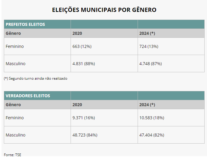 Em 2020, das 58 mil vagas de vereador, 9,3 mil (ou 16,13%) foram preenchidas por mulheres. Agora, das 58,3 mil vagas, 10,6 mil (18,24%) foram ocupadas por elas. Foram eleitas no primeiro turno das eleições 724 prefeitas, o que representa 13% do total de prefeitos do País. Em 2020, foram 663 prefeitas eleitas (12%).