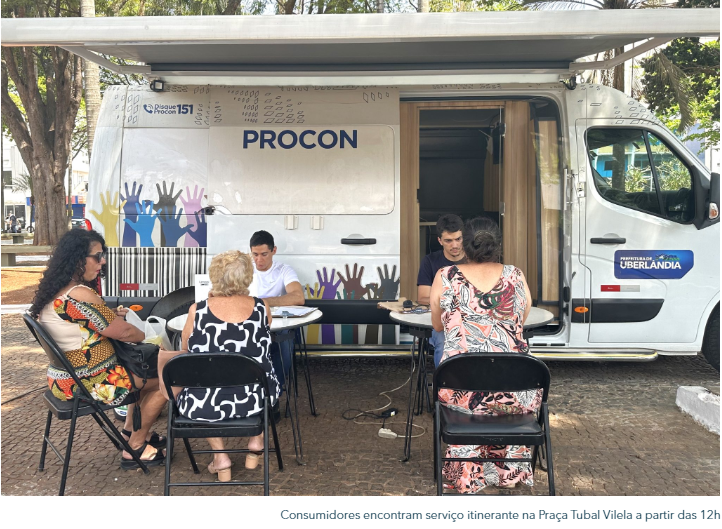 Na van da Superintendência de Proteção e Defesa do Consumidor (Procon) de Uberlândia, os consumidores podem receber informações sobre o uso do aplicativo Fale Procon, registrar reclamações, tirar dúvidas e fazer denúncias relacionadas a relações de consumo.