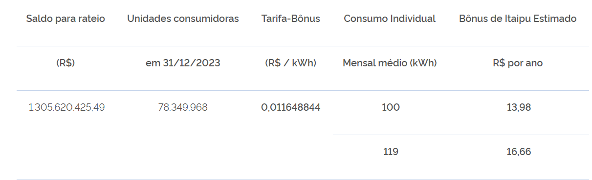 Se, hipoteticamente, uma família consumiu exatamente 100 kWh por mês nos 12 meses do ano, o cálculo será de R$ 0,011648844 (tarifa-bônus) x 100 (consumo mensal em kWh) x 12 (meses), totalizando R$ 13,98. Como a média de consumo em 2023 entre os 78,3 milhões de unidades beneficiadas foi de 119 kWh por mês, uma família com esse consumo receberia o bônus de R$ 16,66.