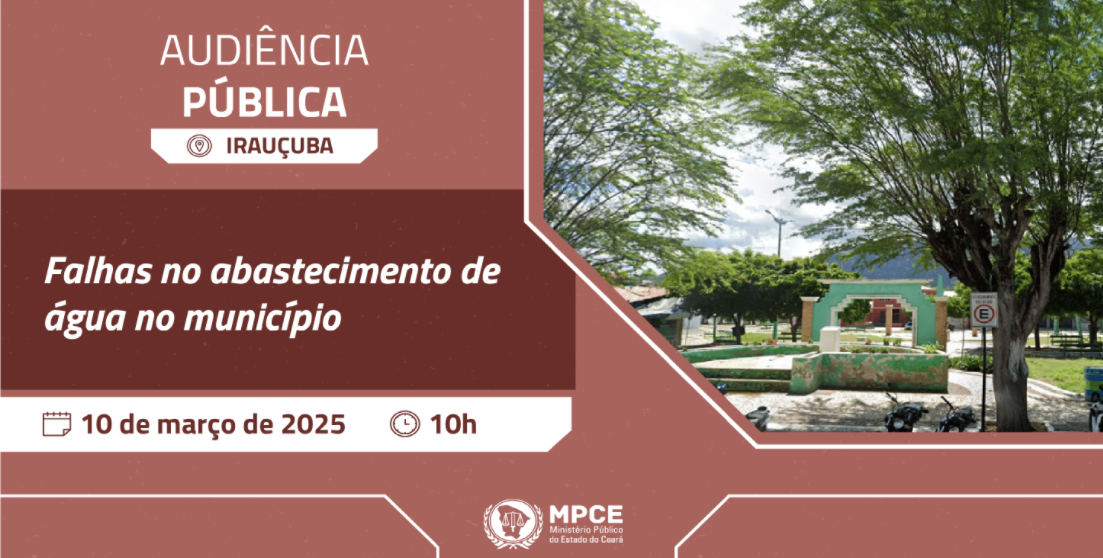 O Ministério Público do Estado do Ceará (MPCE), por meio da Promotoria de Justiça Vinculada de Irauçuba, promove, no dia 10 de março, às 10h, audiência pública no auditório da Secretaria Municipal de Educação para discutir falhas no abastecimento de água na cidade.