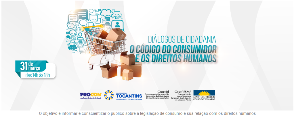 O Ministério Público do Estado do Tocantins (MPTO), por meio do Centro de Estudos e Aperfeiçoamento Funcional - Escola Superior do Ministério Público (Cesaf-ESMP) e do Centro de Apoio Operacional do Consumidor, da Cidadania, dos Direitos Humanos e da Mulher (Caoccid), realiza no dia 31 de março, no auditório térreo do MPTO, em Palmas, o evento "Diálogos de Cidadania: o Código do Consumidor e os Direitos Humanos".